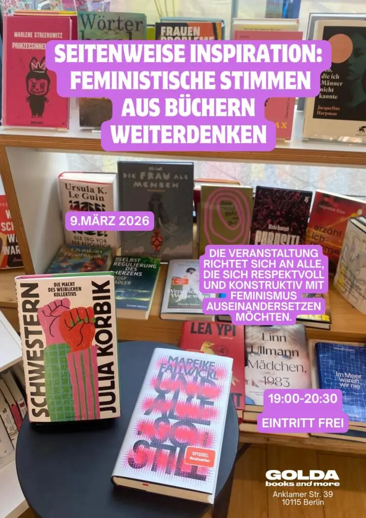 Zum Weltfrauentag öffnet die Buchhandlung Golda mit ihren Büchern einen Raum für Begegnung und Austausch. Ausgewählte feministische Bücher inspirieren zu Gesprächen über Solidarität, Mut und gesellschaftliche Veränderung. Mit einer Mischung aus interaktiven Elementen und Lese-Momenten lädt die Veranstaltung dazu ein, Perspektiven zu teilen, sich zu vernetzen und gemeinsam neue Ideen zu entwickeln.